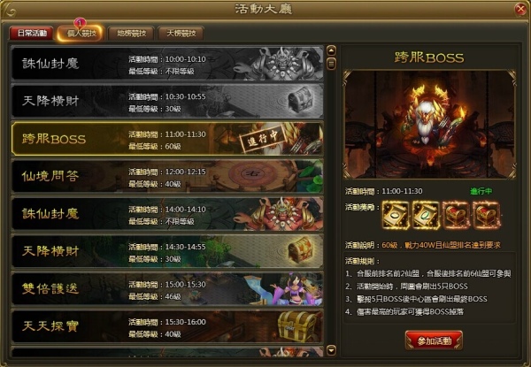 當玩家角色等級達 Lv60 及所在仙盟在伺服器中排前2時,便可開放跨服 BOSS 功能,玩家在活動大廳菜單的日常活動中便可找到其選項。每日開放時間段有兩個,分別為 11:00~11:30 及 23:00~23:30。
